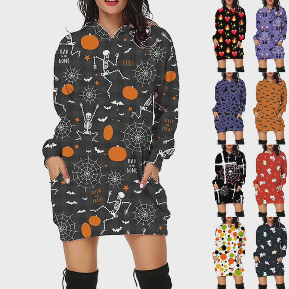 Halloween Print Long Hoodie 2025 | Women’s Long Sleeve Hoodie with Pockets | Casual Halloween Sweatshirt - SC10 / L