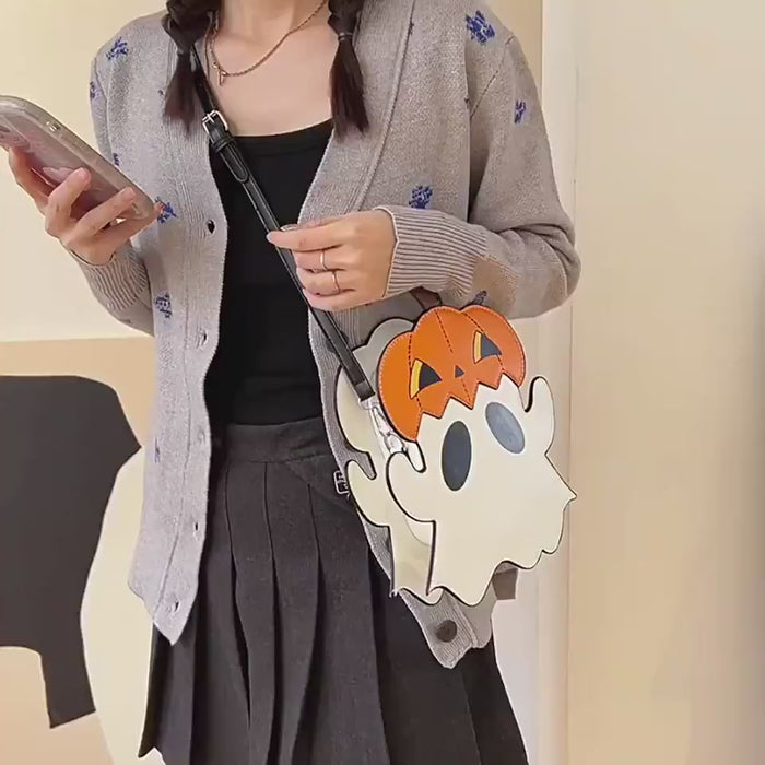 Halloween Shoulder Bags – Creative 3D Pumpkin & Ghost Cartoon Design | Women’s Crossbody Candy & Cell Phone Purses - White